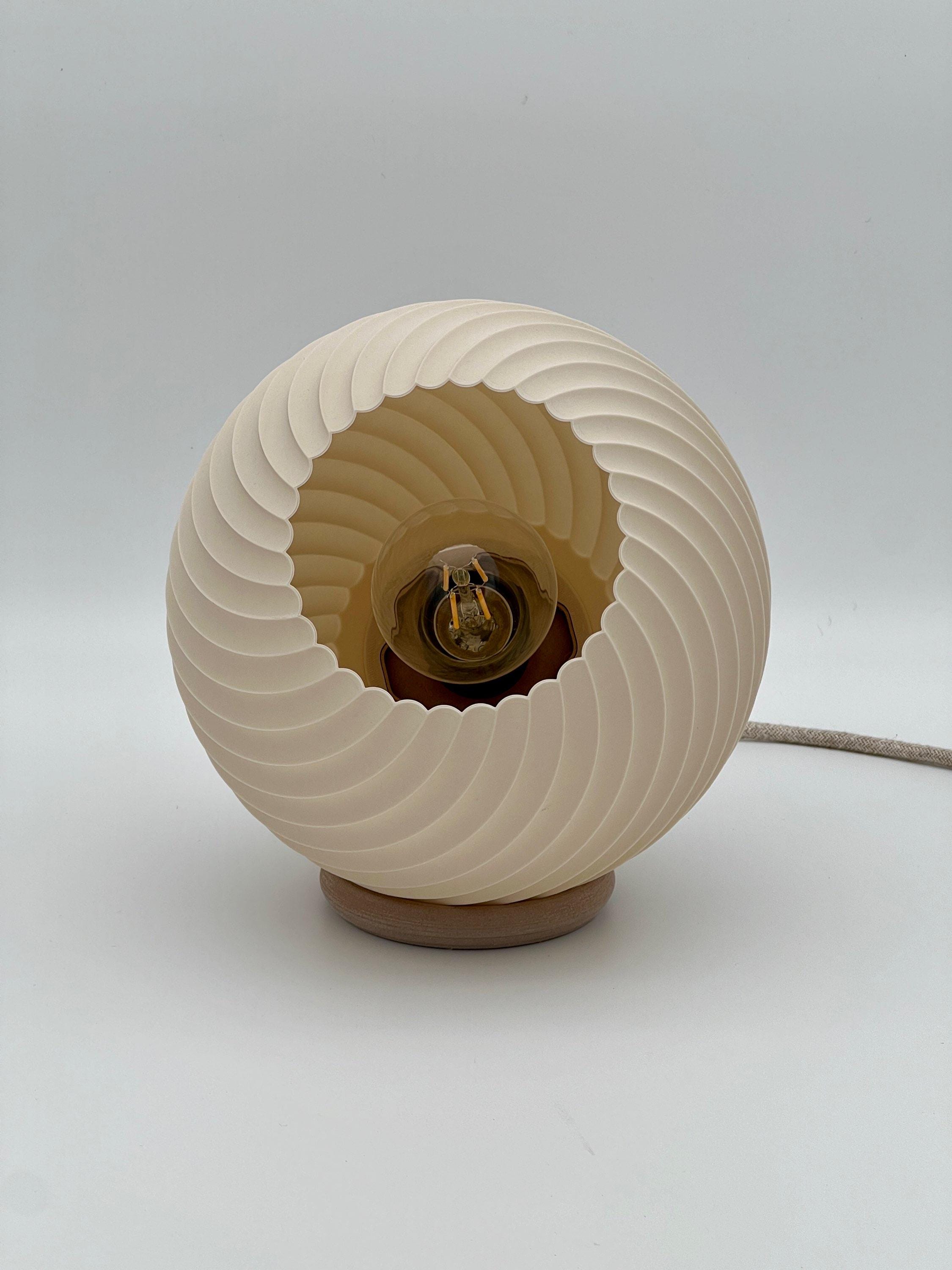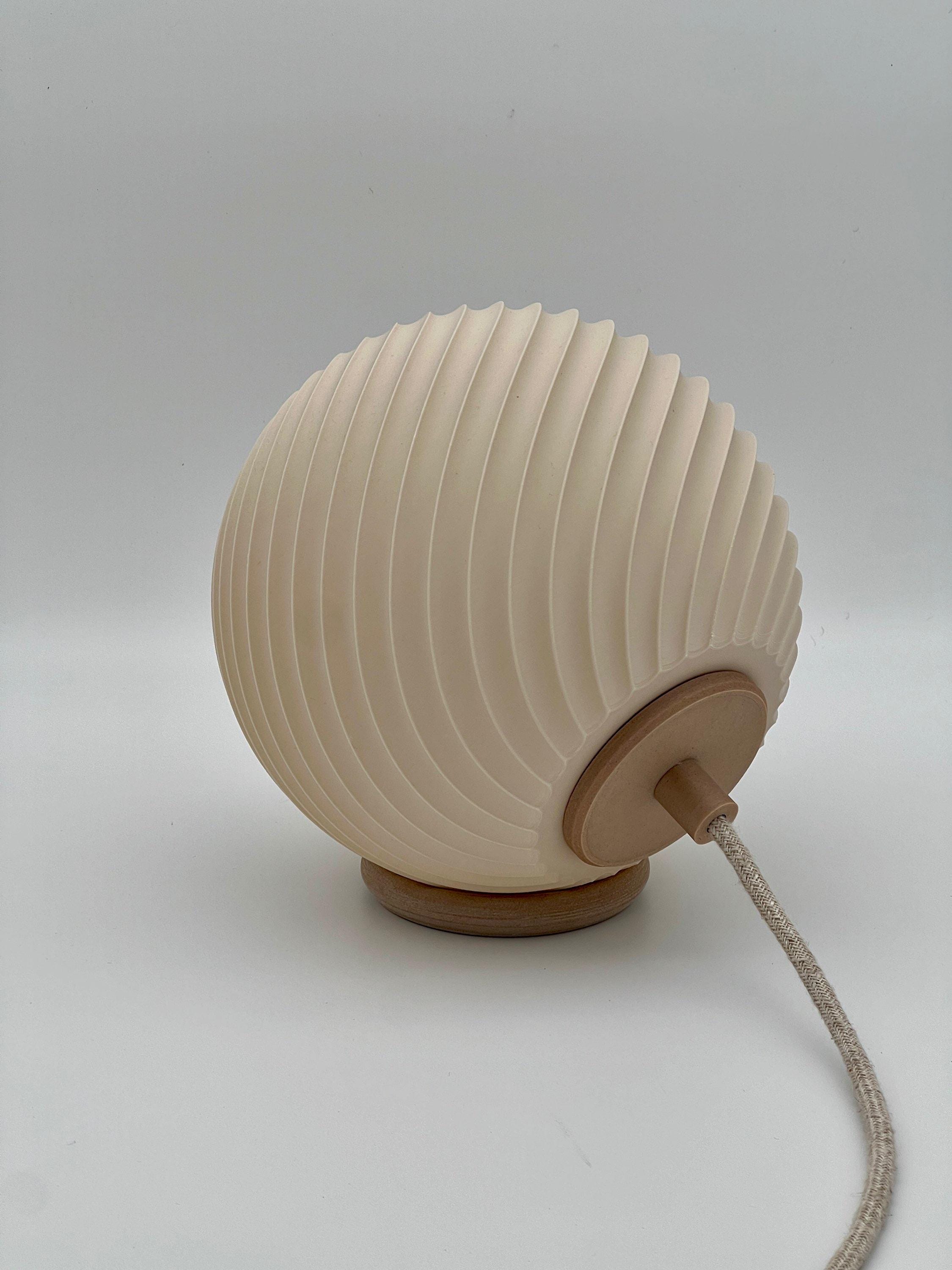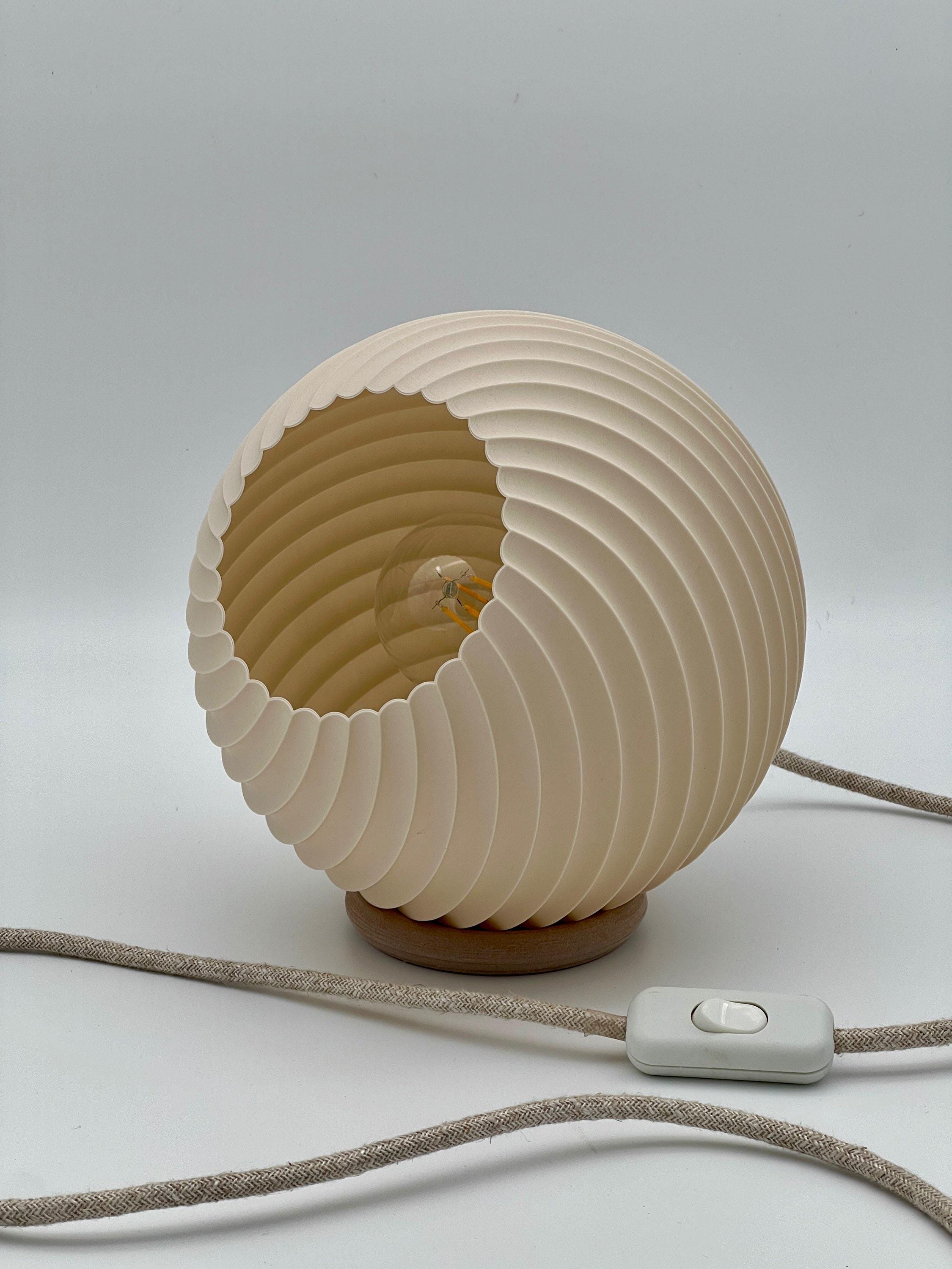 The shade is made of a polymer derived from flax seeds. The base is made of oak wood and sanded by hand. All components are connected with magnets. The shade can be rotated in all directions. It is operated with a cable switch.