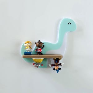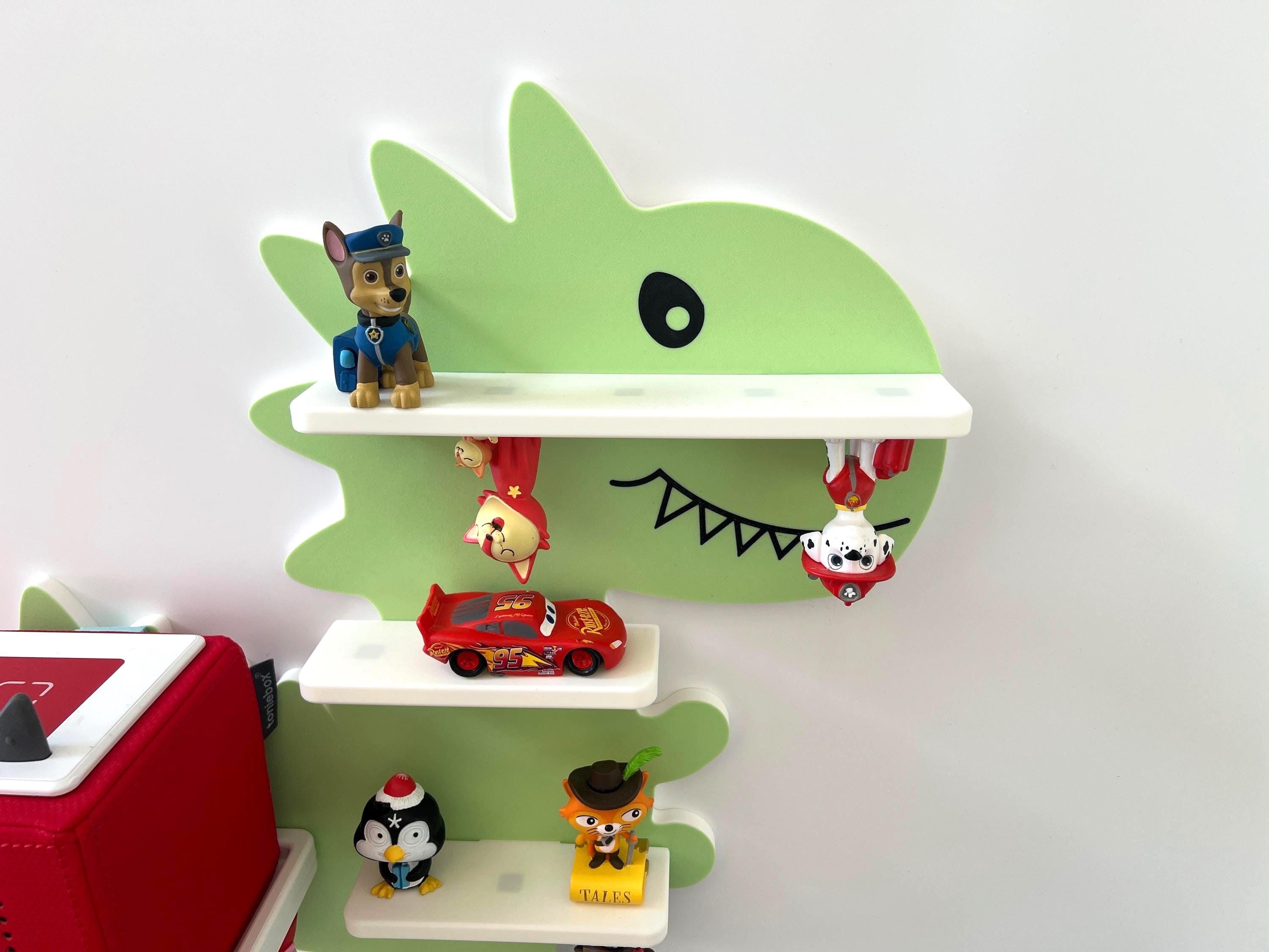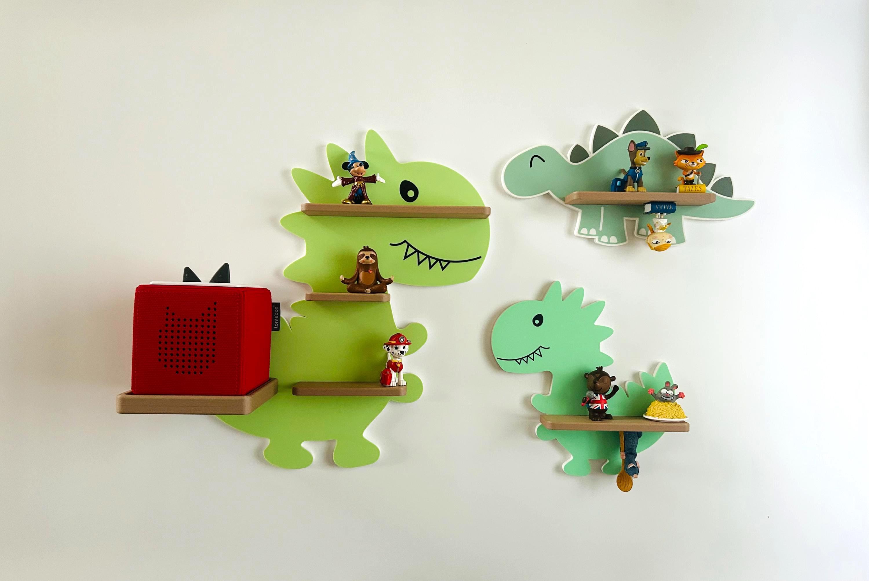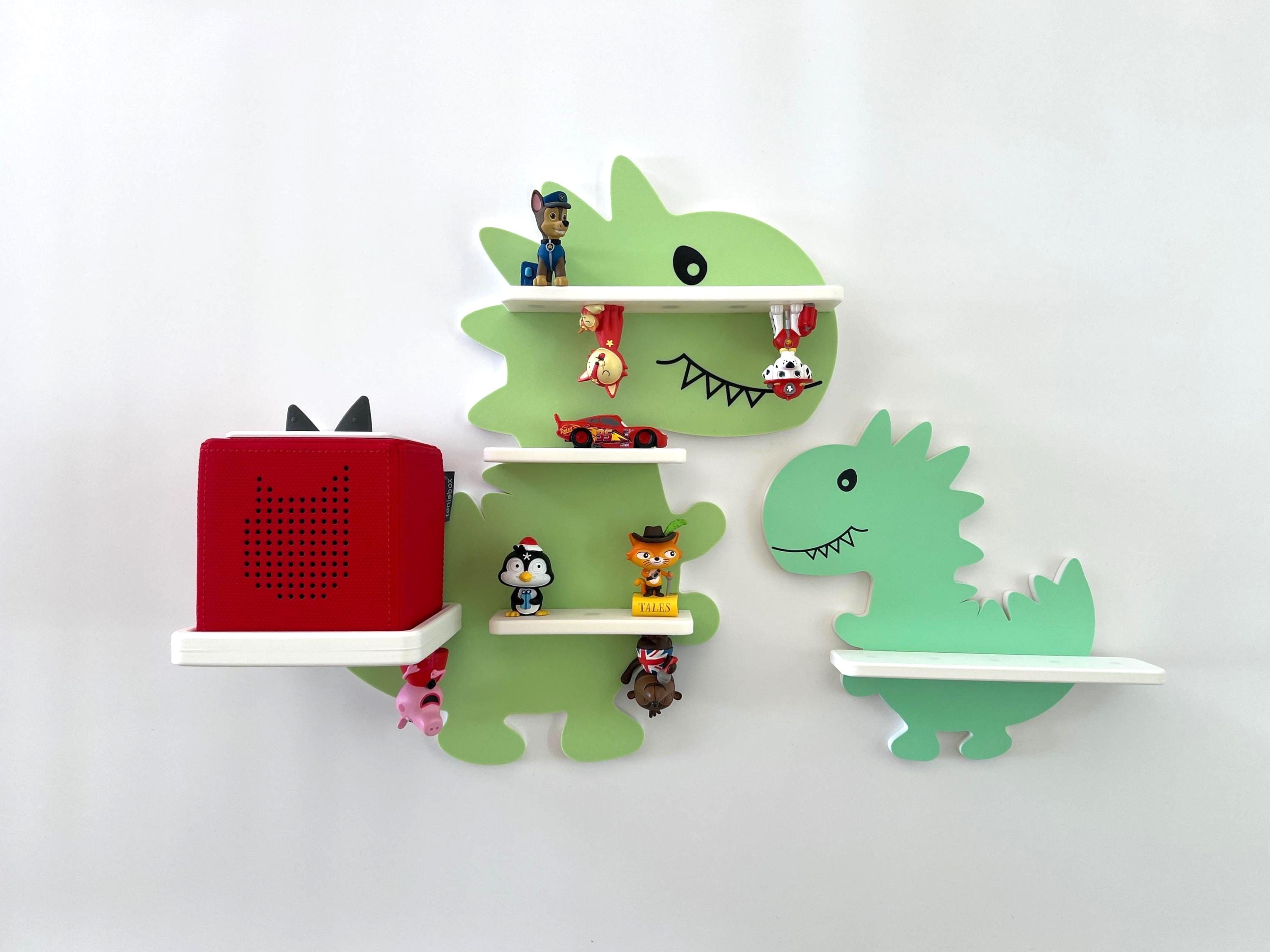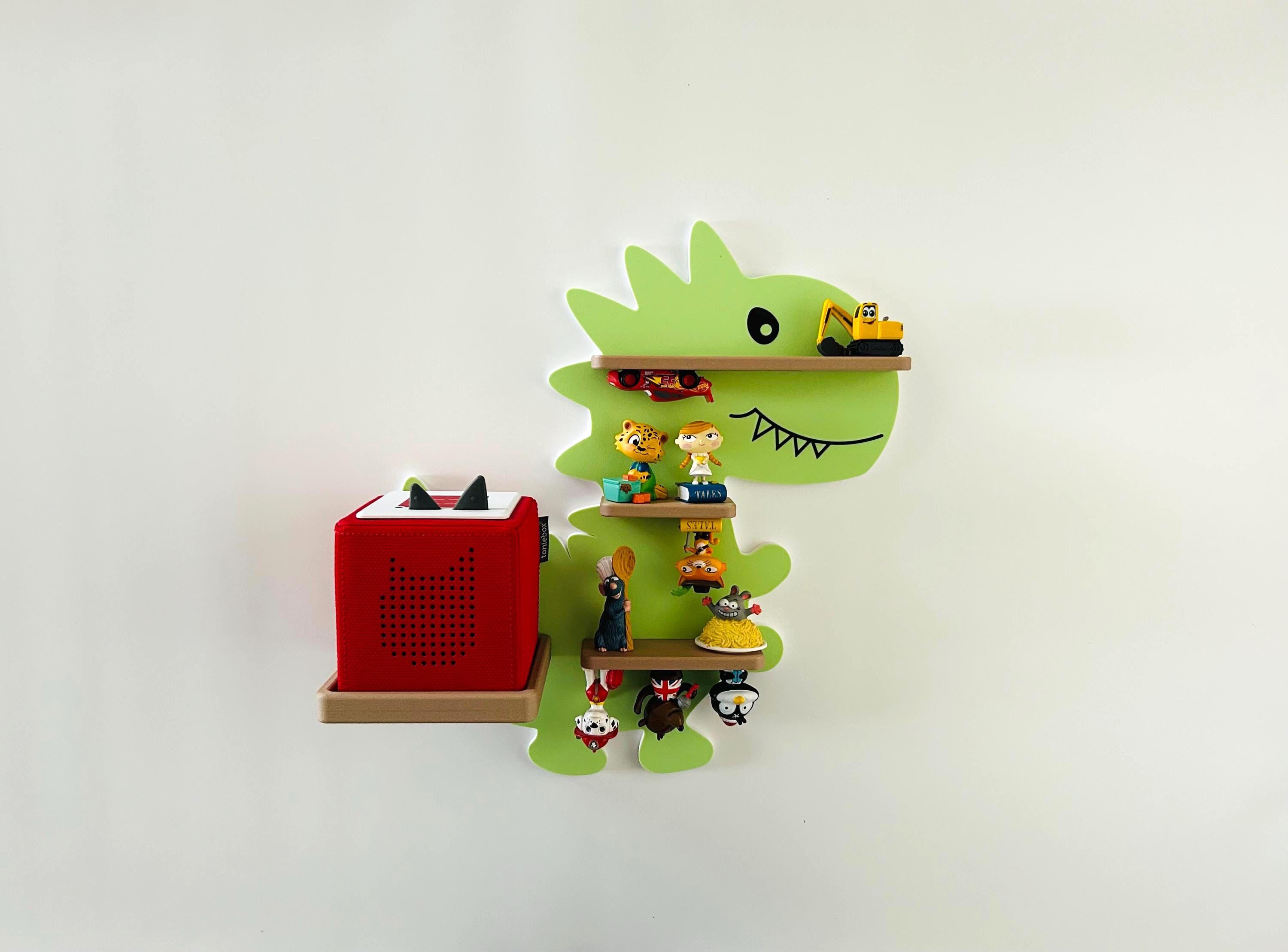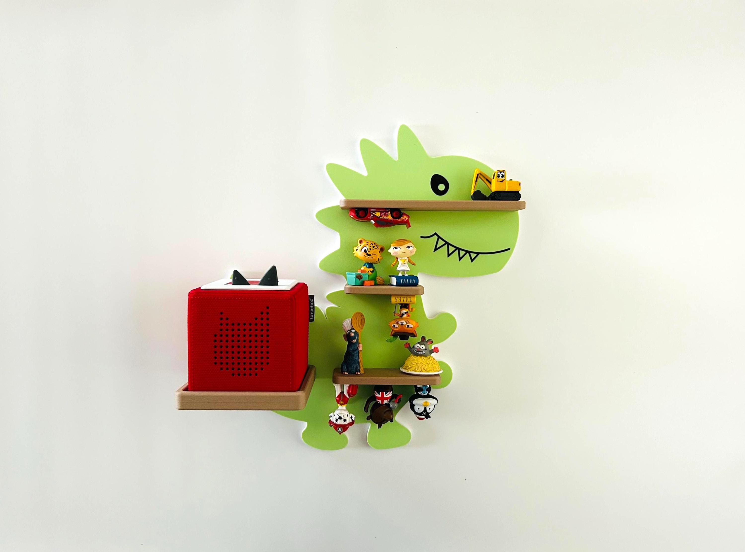 The dinosaur shelf has magnets embedded in it to which the Tonies figures can be attached. The magnets are inside the shelves and therefore very safe for even the youngest Tonie fans. because they cannot escape!