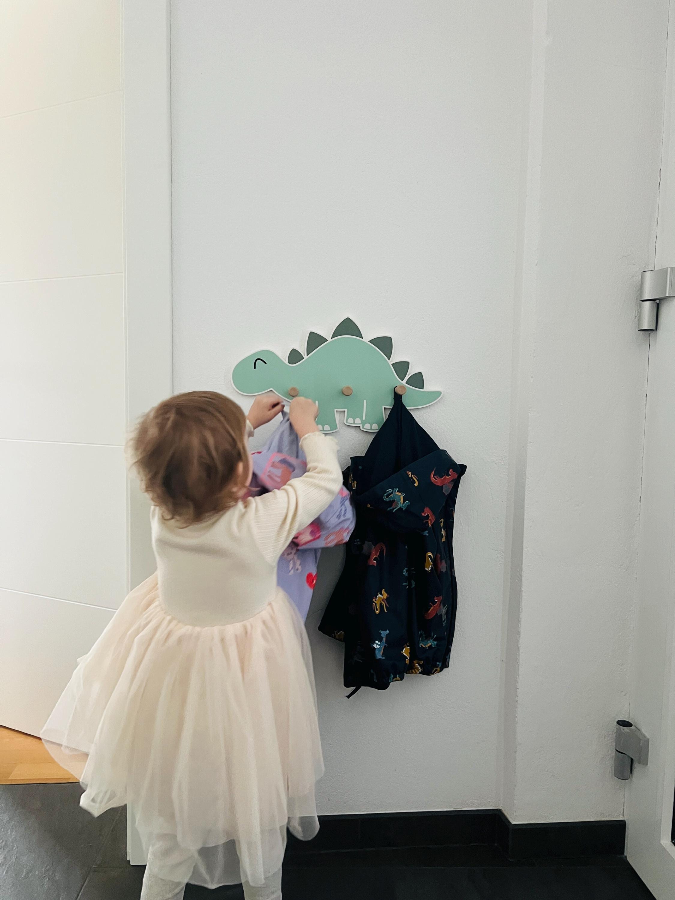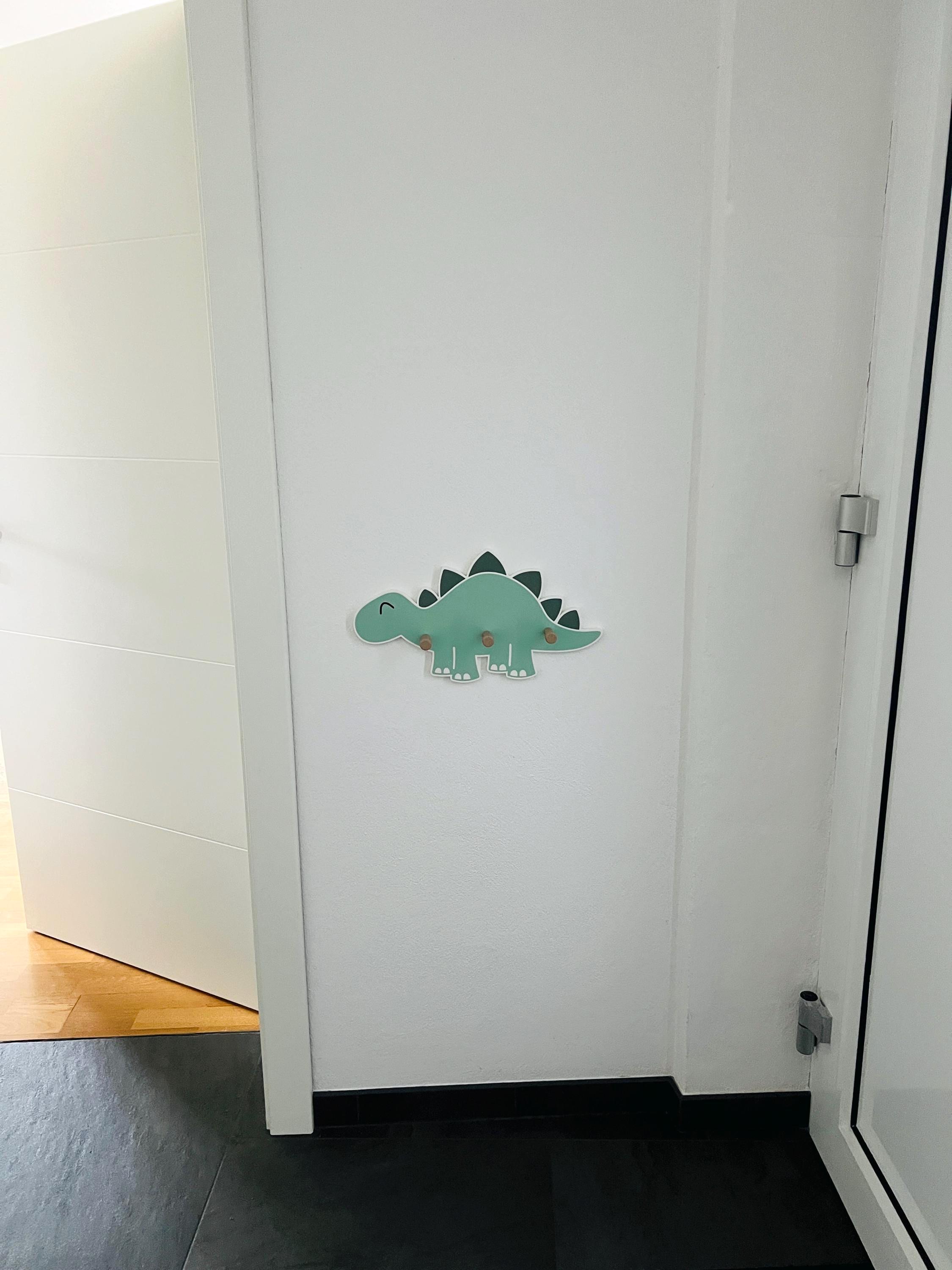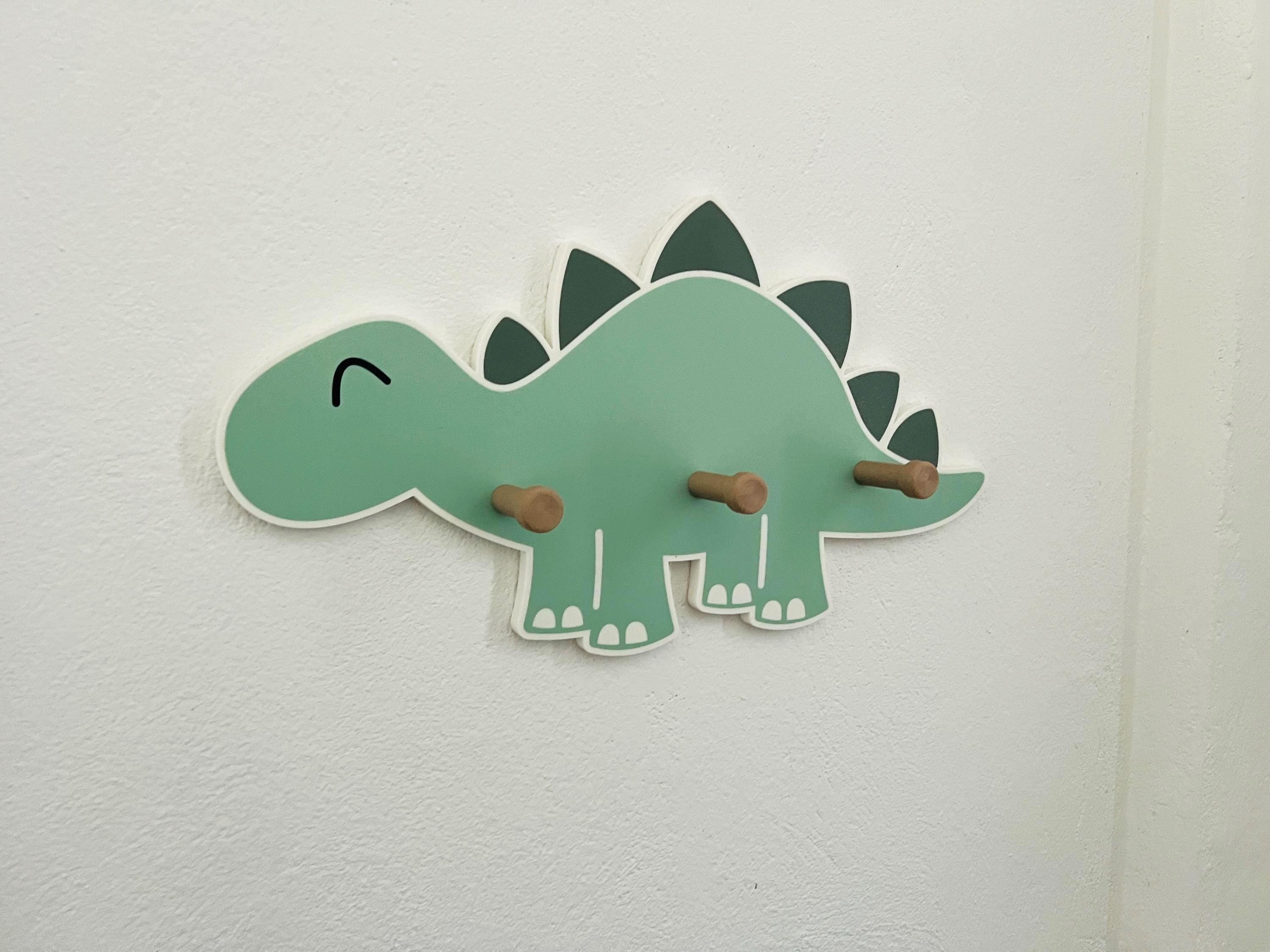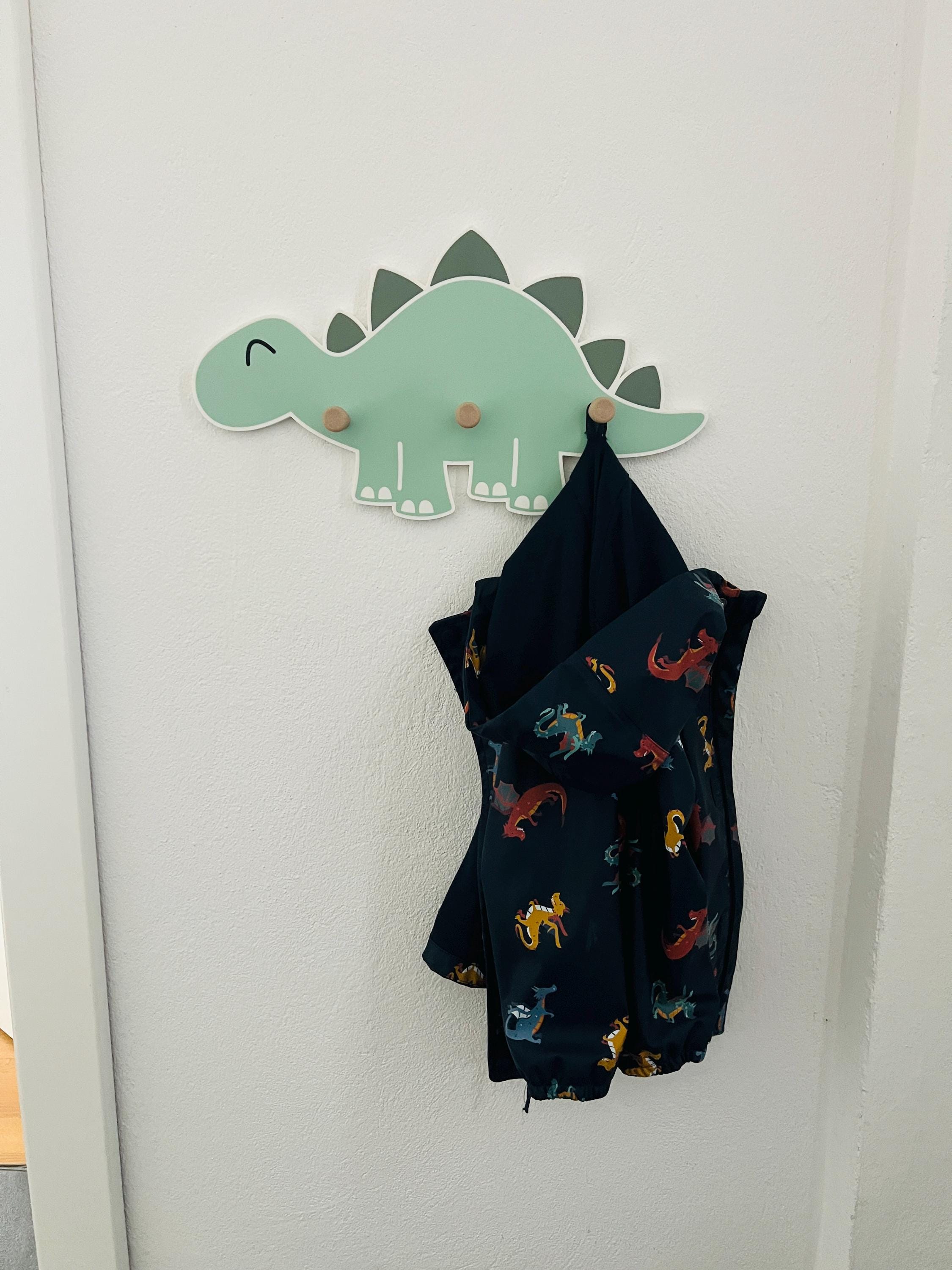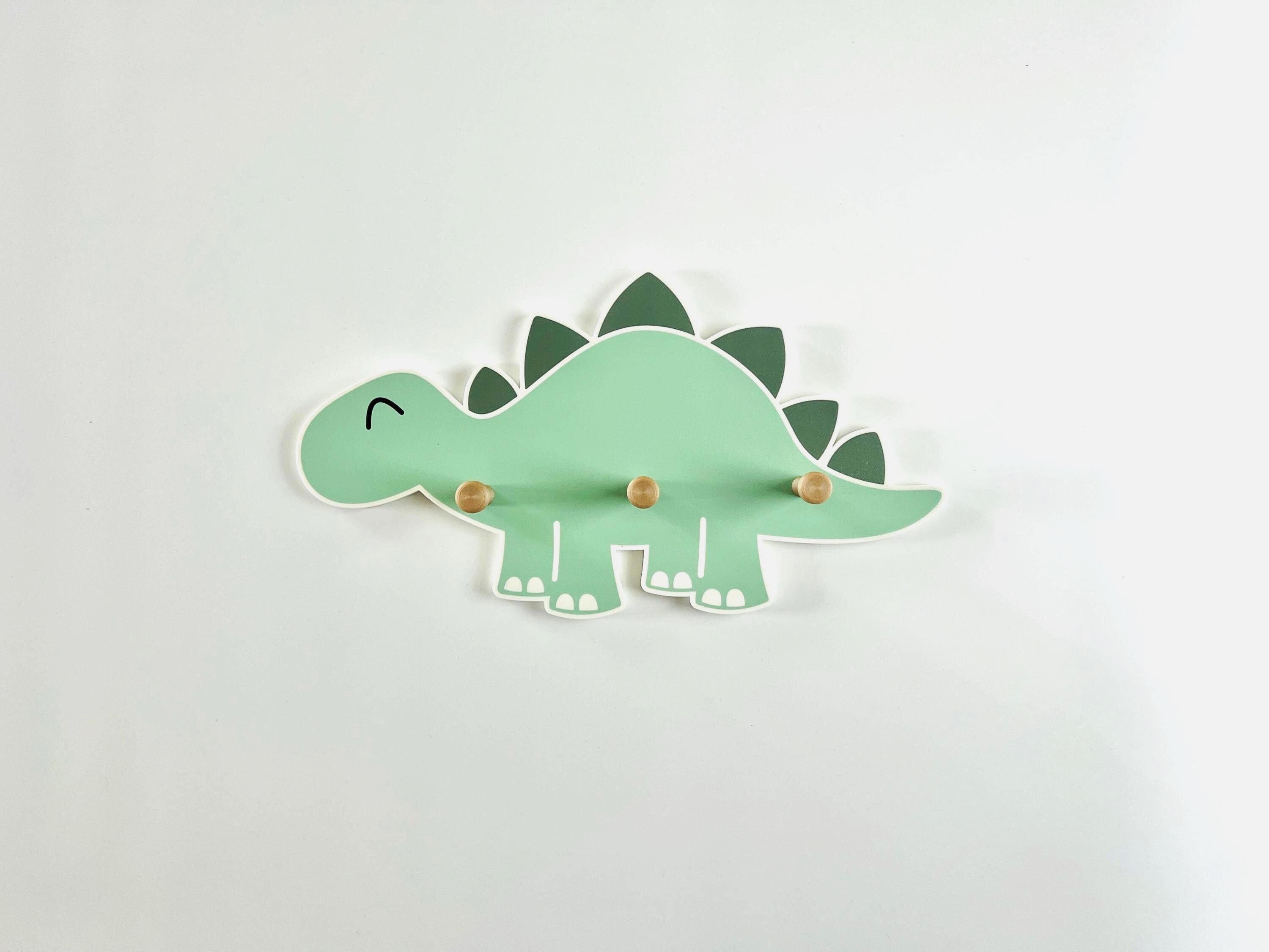 Great dinosaur wall shelf with 3 wooden coat hooks.