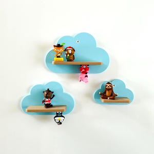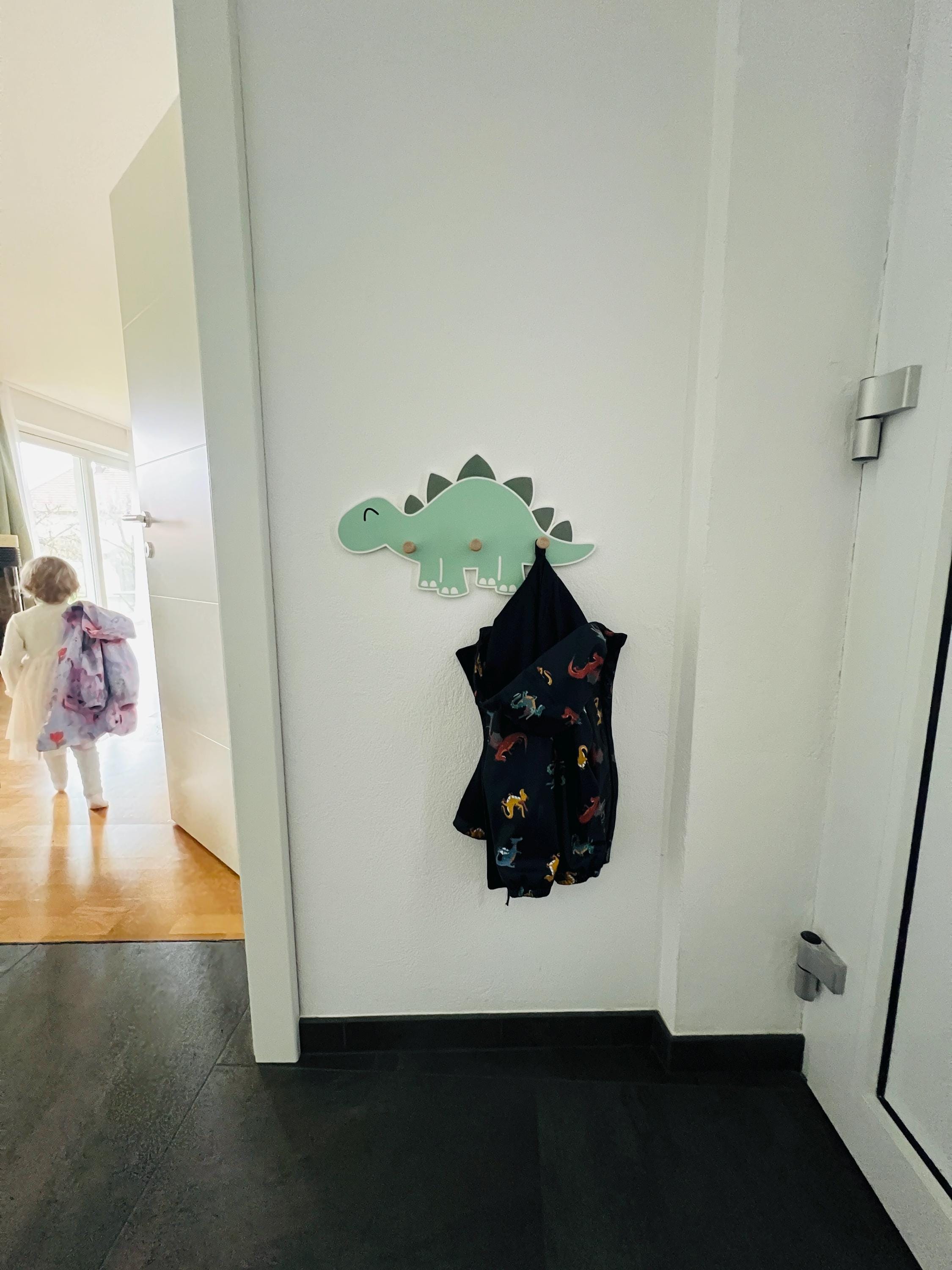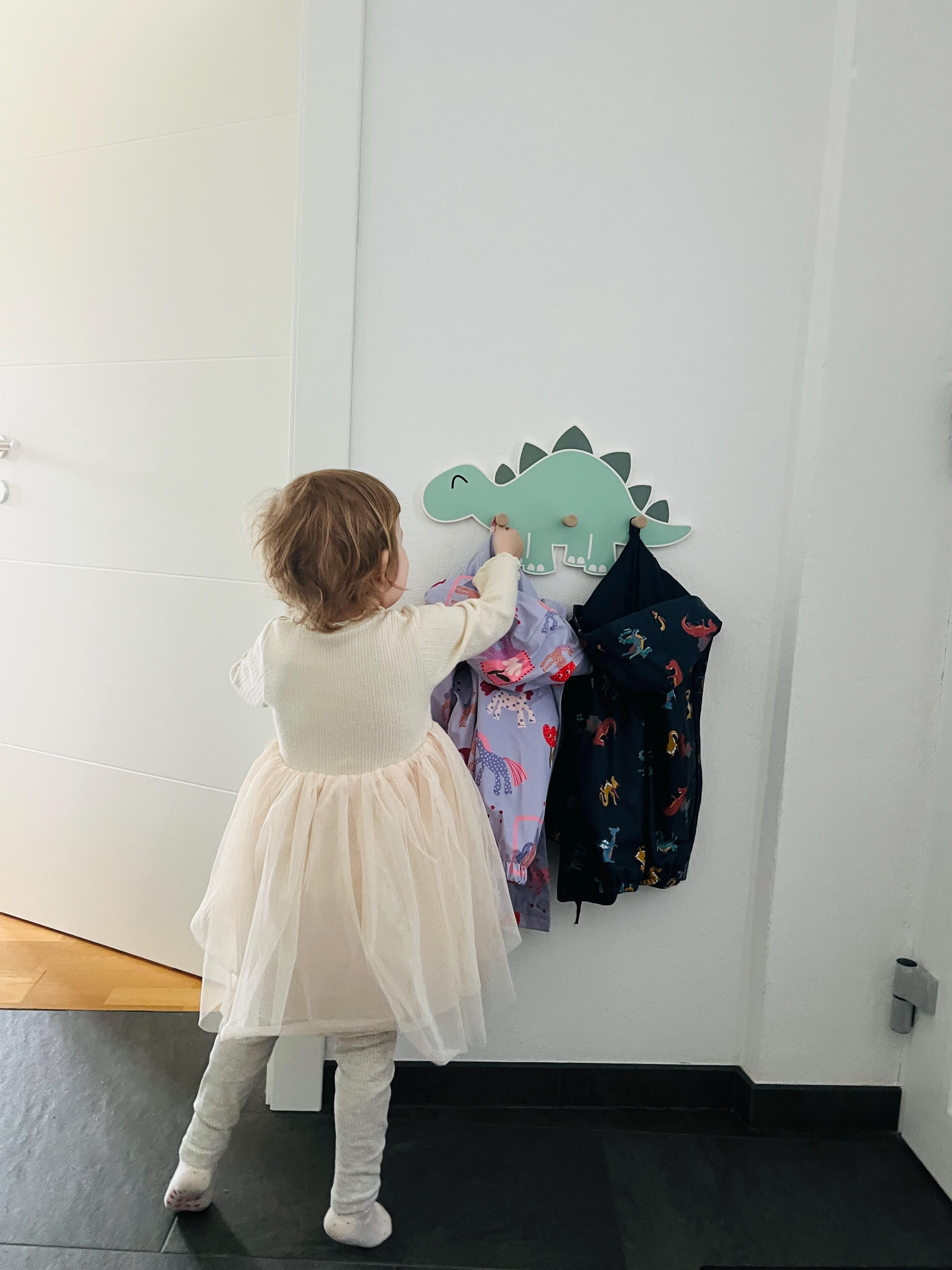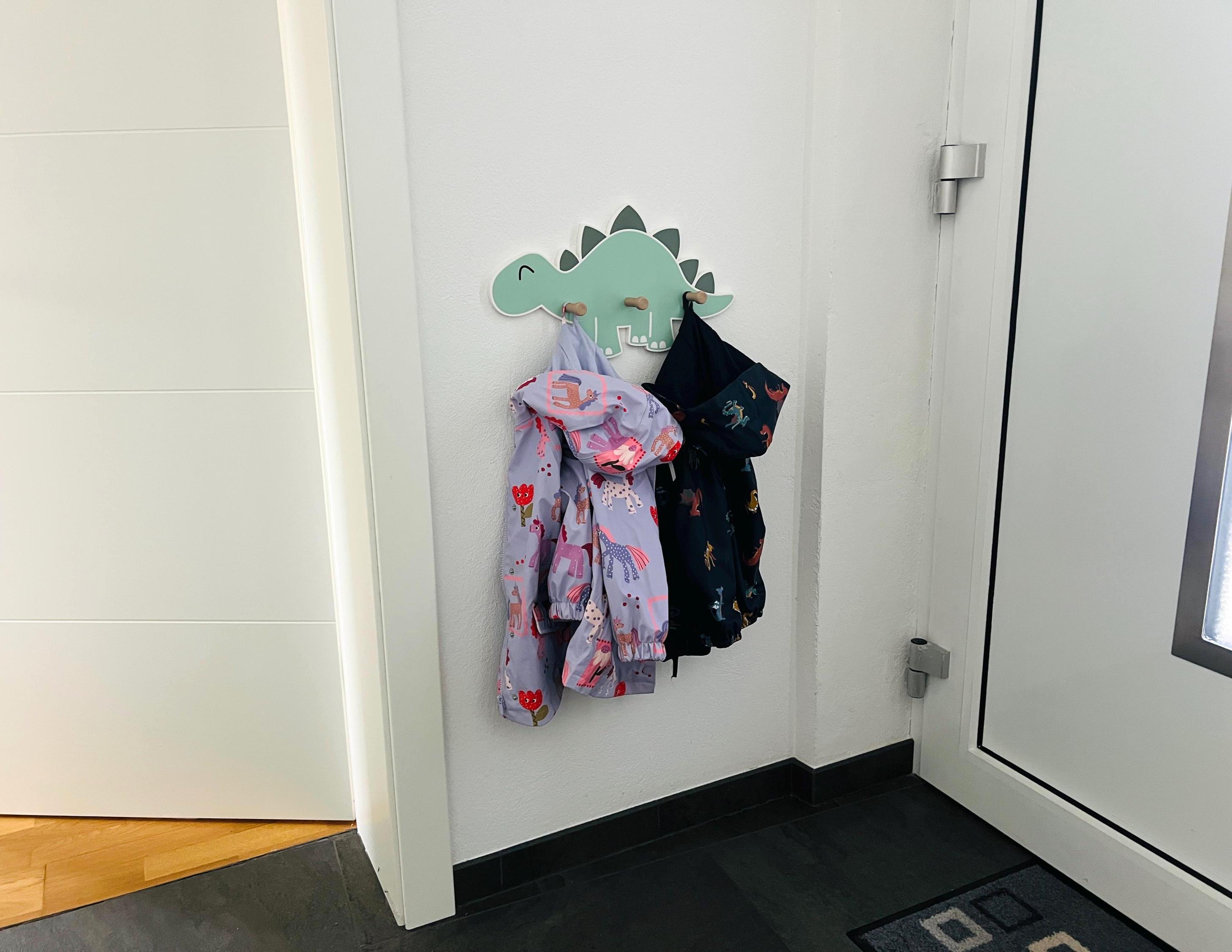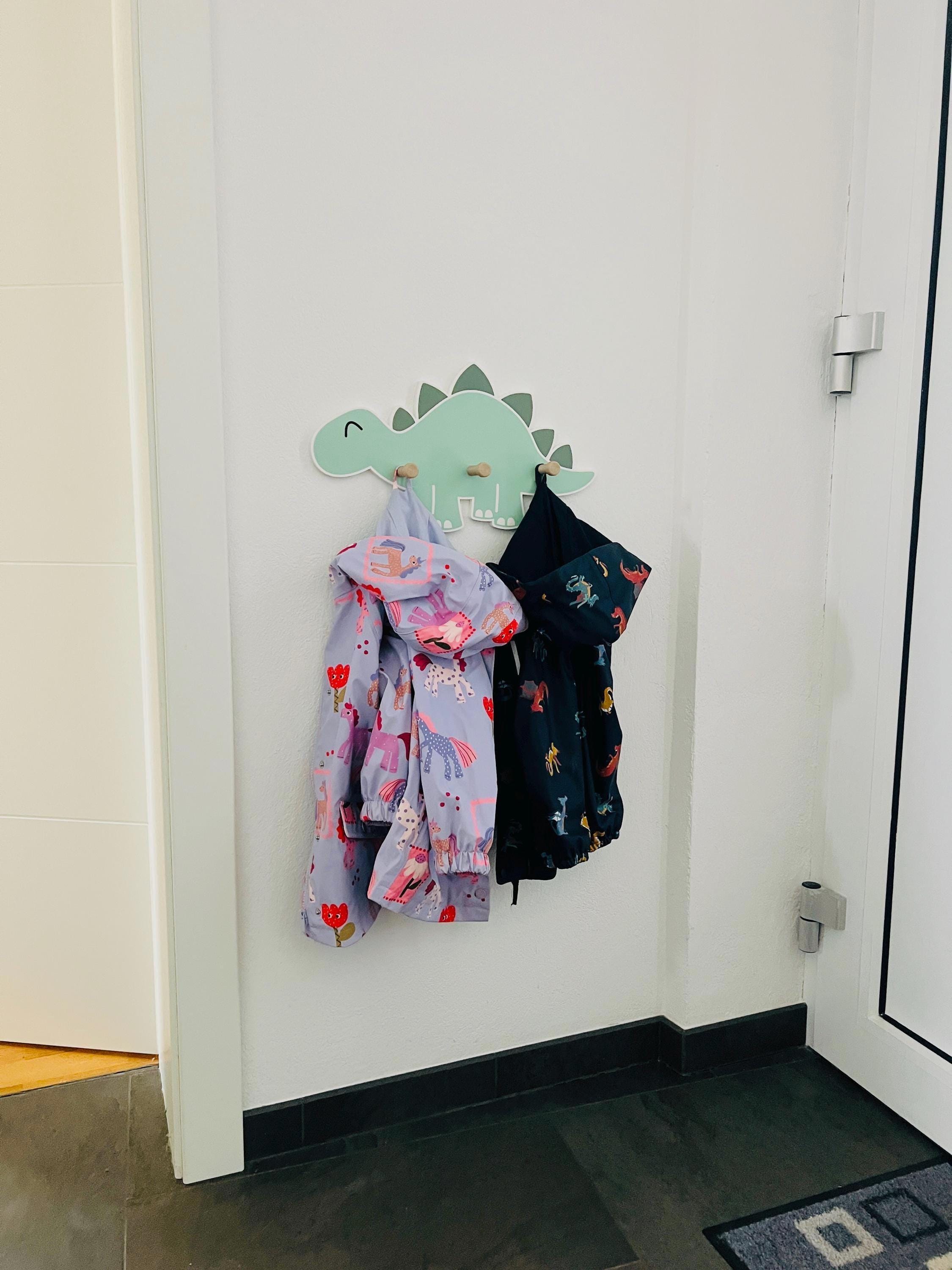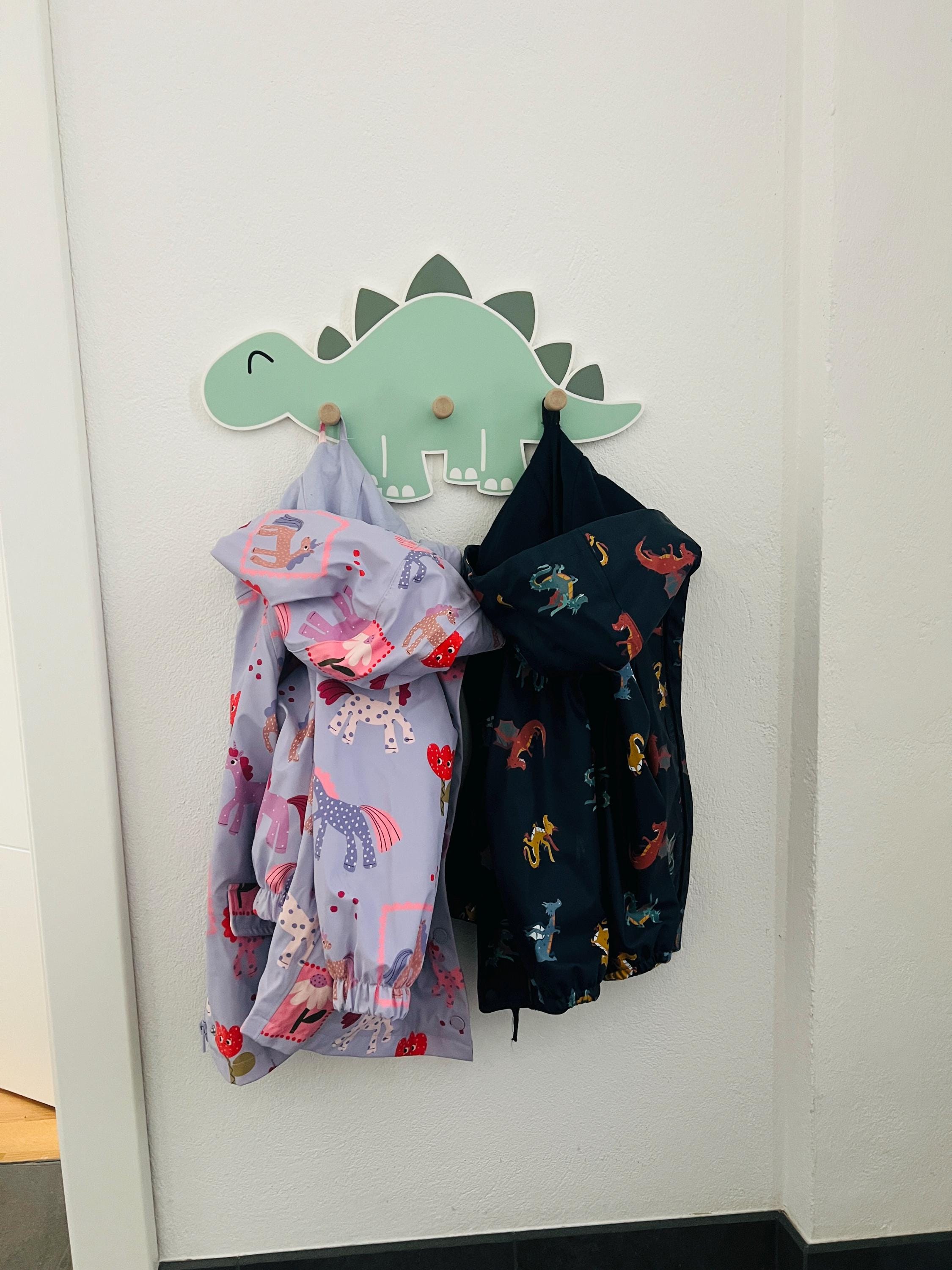 Great dinosaur wall shelf with 3 wooden coat hooks.