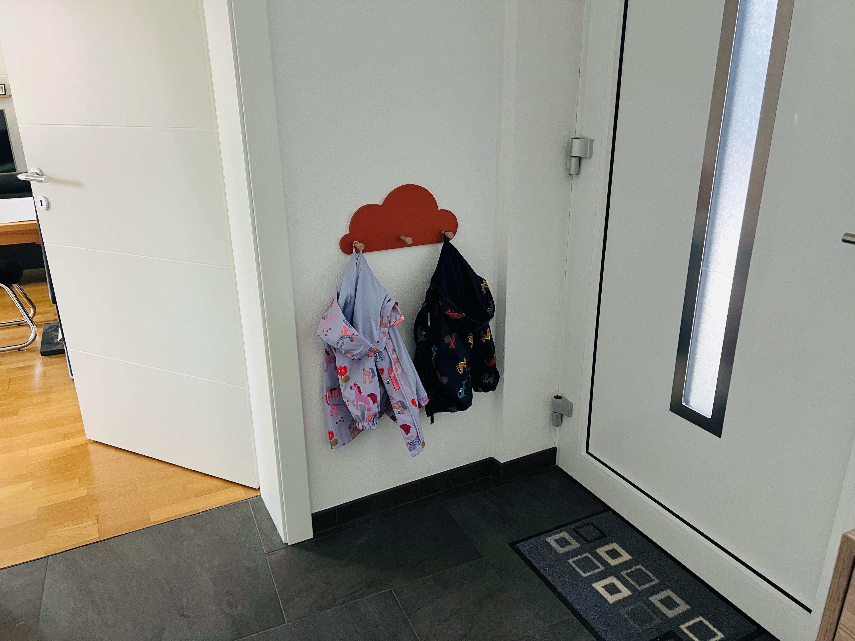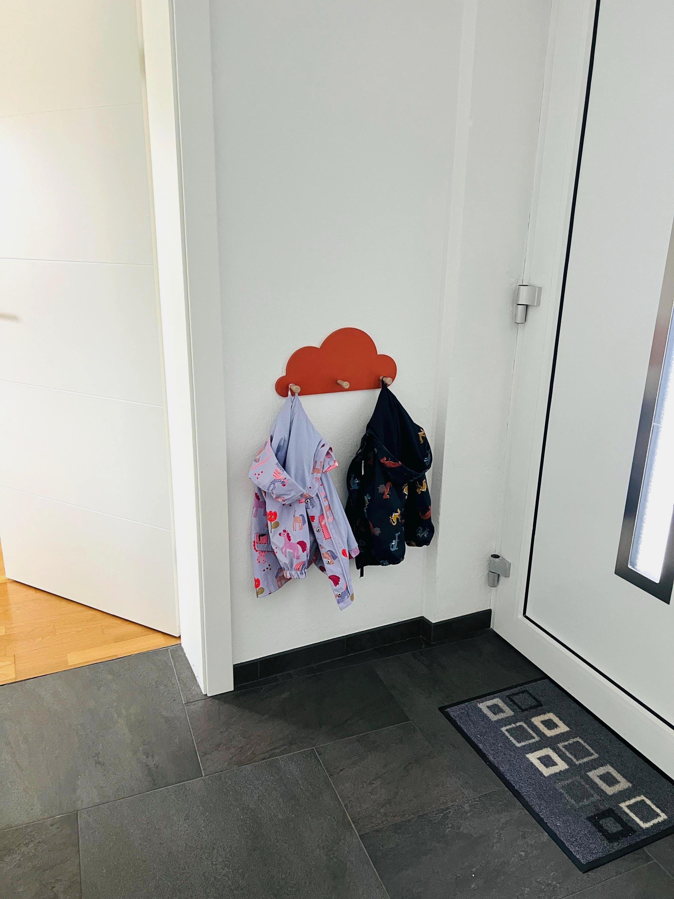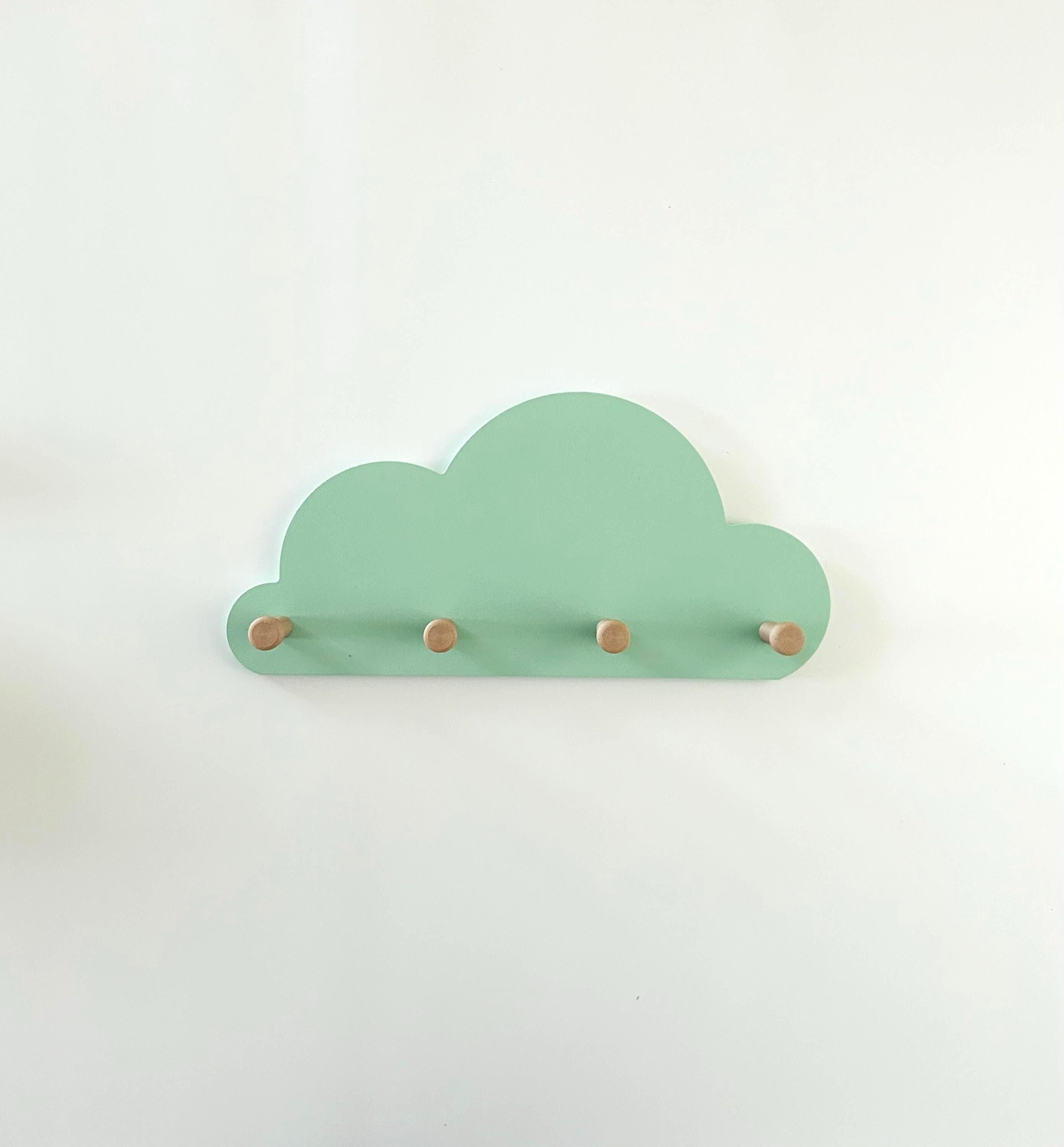 Great cloud-shaped wall shelf with 3 wooden coat hooks.